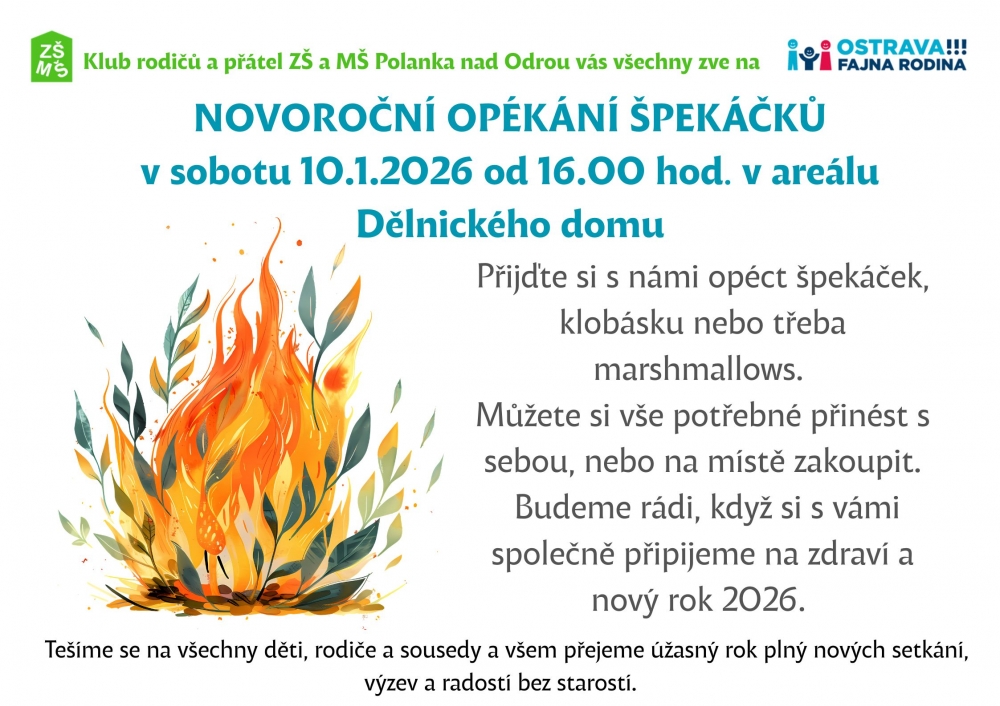V sobotu 10. 1. se bude od 16:00 konat přátelské setkání u ohňů. Přijďte na opékání dobrot v areálu Dělnického domu. Zve KRPŠ.05.01.2026 Zpět