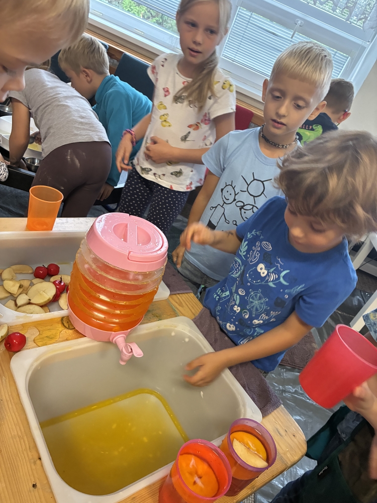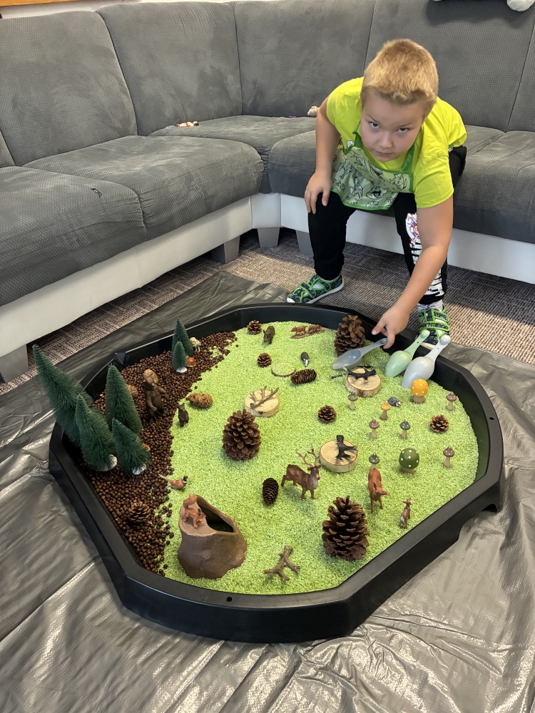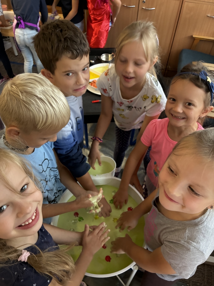 Na konci září si žáčci prvních tříd rozvíjeli fantazii, jemnou motoriku i vzájemné vztahy při lekci smyslohraní. Na několika stanovištích na prvňáčky čekaly podzimně laděné aktivity. Uvařili si jablečný mošt i poctivý zeleninový vývar. Procvičili prstíky při vytahování jablíček z hmoty, která se jim roztékala v dlaních. A během expedice do lesa objevovali šišky, houby i zvířata od veverky až po medvěda. Nechybělo ani poznávání stop některých zvířat. Velký úspěch měly hry s vodními perlami, kinetickým pískem, plastelínou, rýží či cizrnou.
