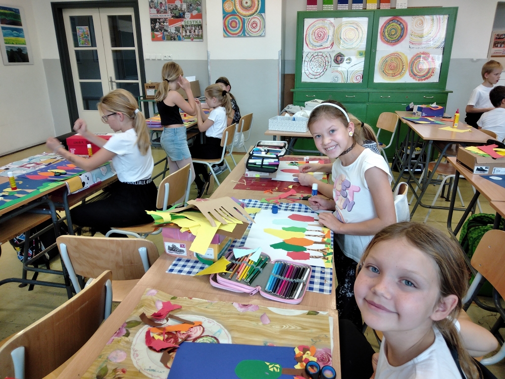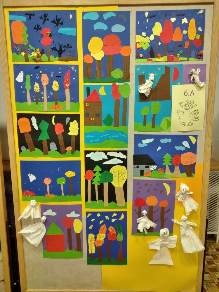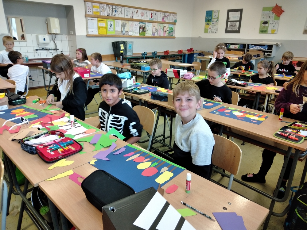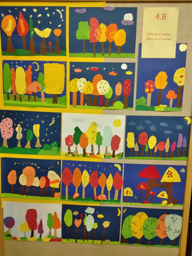S největším zaujetím se do koláží z barevných papírů pustili žáci ze 4. ročníku. Ale i výkresy starší žáků se vydařily a zdobí vstup do školy.