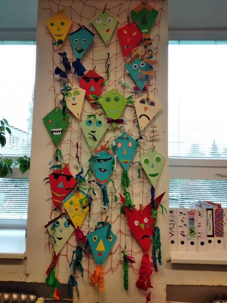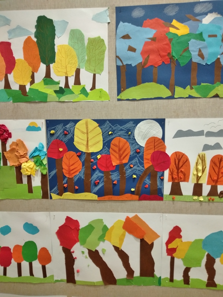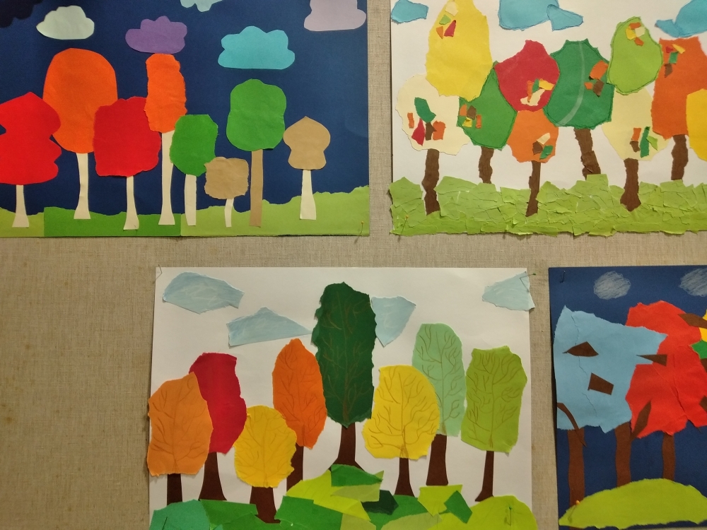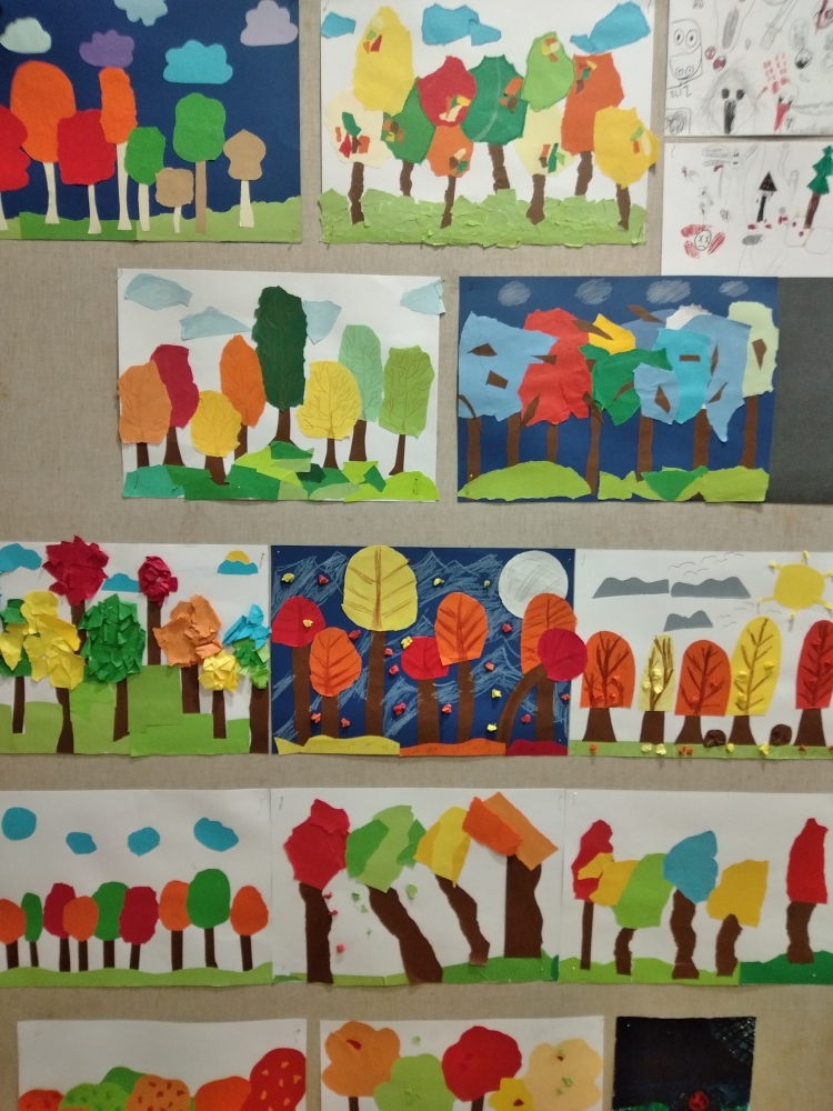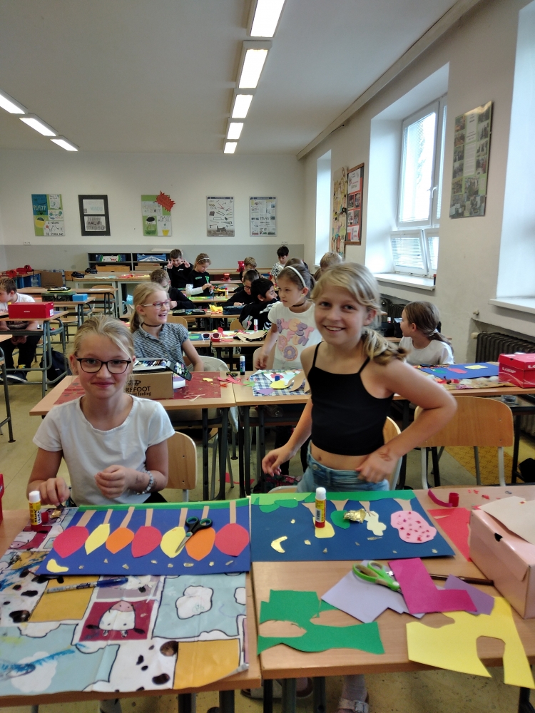 S největším zaujetím se do koláží z barevných papírů pustili žáci ze 4. ročníku. Ale i výkresy starší žáků se vydařily a zdobí vstup do školy.