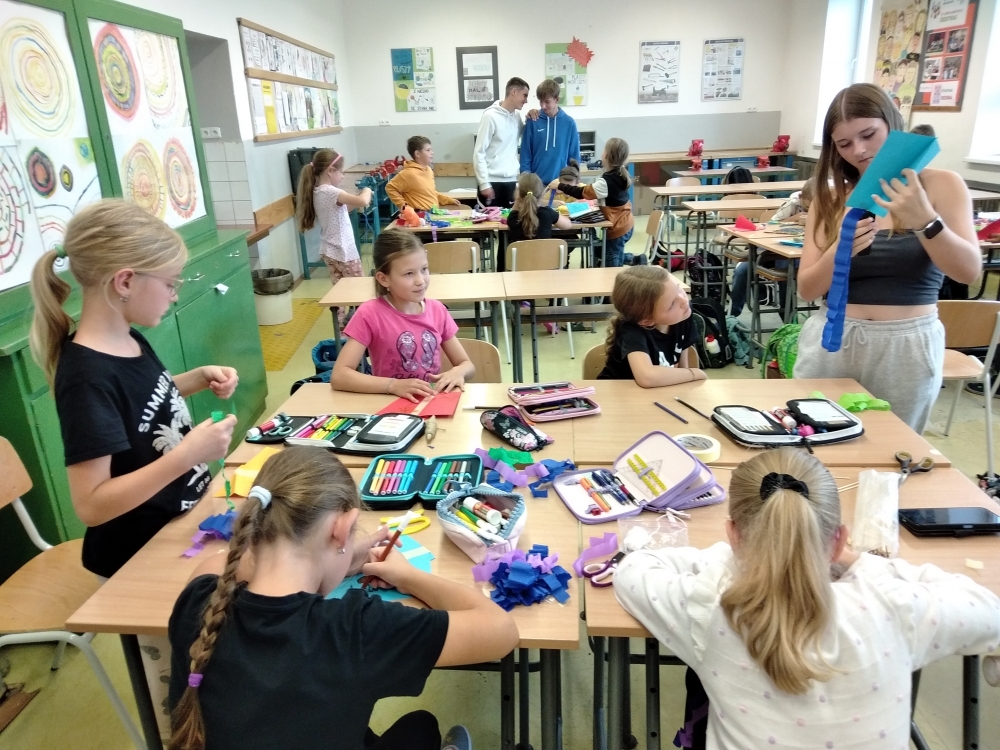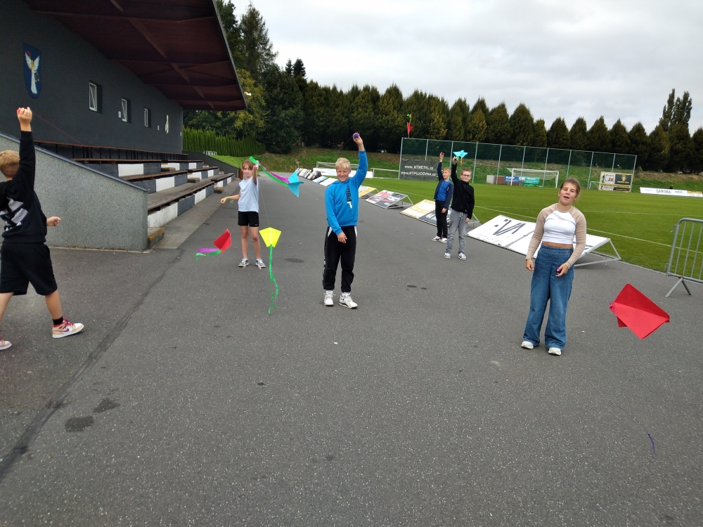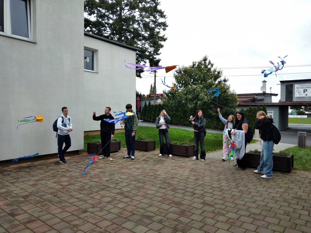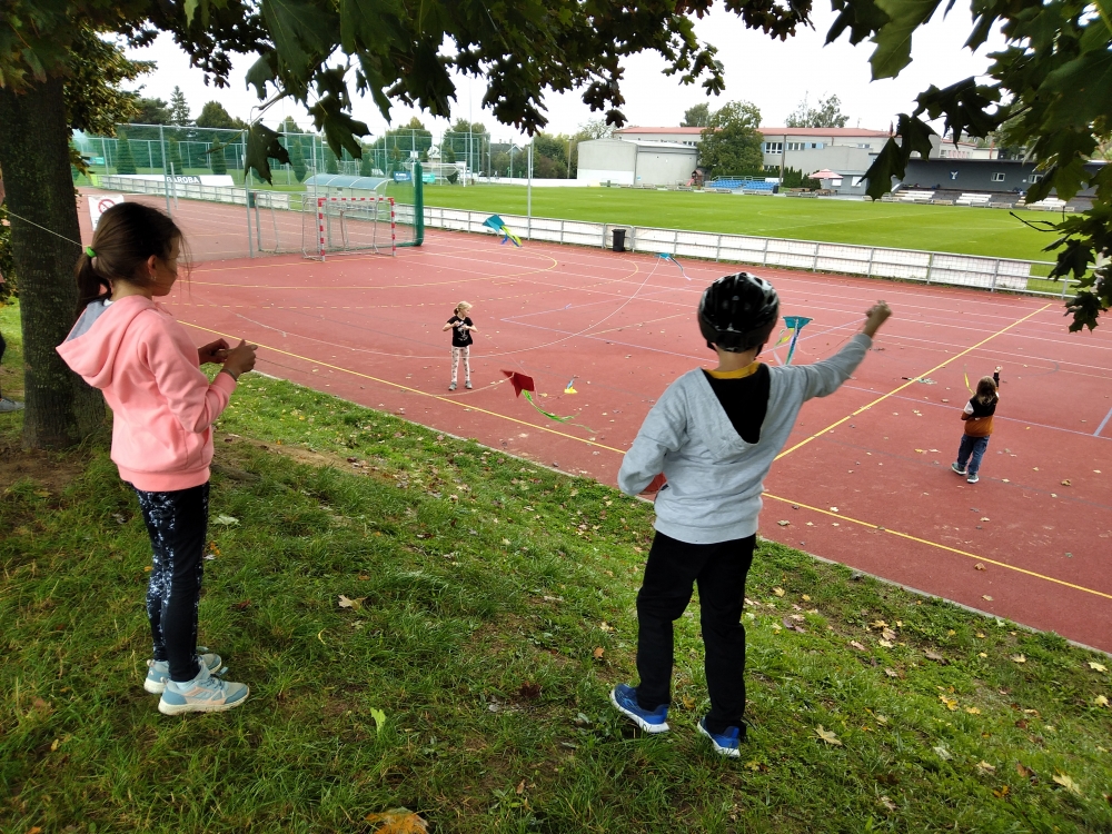 K podzimu neodmyslitelně patří i pouštění draků. Žáci 2. stupně si draka dokázali za krátkou dobu vyrobit sami a hned si i vyzkoušeli, jak létá. Těm mladším pomohli žáci z 9. ročníku.