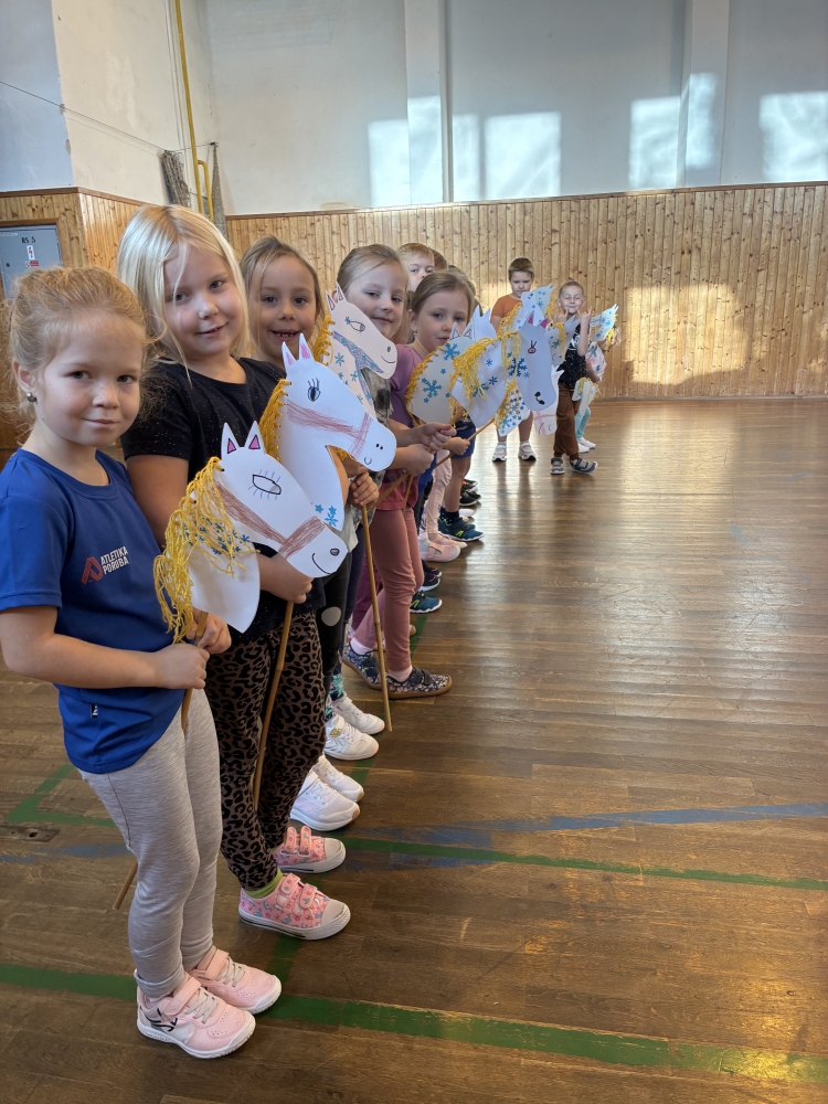 Koníci se dětem povedli a bylo by škoda se na ně jen dívat. Proto je děti také osedlaly a za chvíli se ozývalo spokojené řehtání a klapání kopyt. V tělocvičně i venku se rozběhla malá „Velká pardubická“ – tělesnou výchovu si prvňáci zpestřili hobby horsingem.