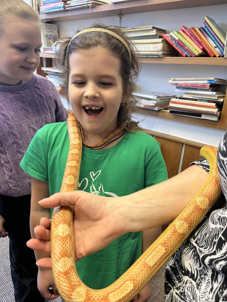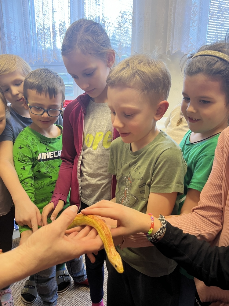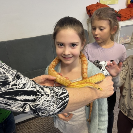 Dnes nás v družině navštívila užovka červená. Děti se dozvěděly spoustu informací a zajímavostí nejen o užovce, ale i o ostatních hadech. Většina dětí sebrala odvahu si hada pohladit, potěžkat a ti největší odvážlivci si užovku dokonce nechali nasadit i za krk. Návštěva se dětem tak líbila, že se s ní nechtěly ani rozloučit a chtěly si užovku nechat v družině napořád.17.03.2025 Zpět