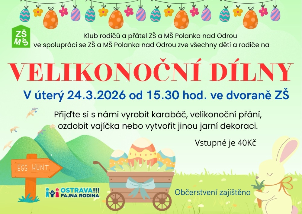 Klub rodičů a přátel školy při ZŠ a MŠ Polanka nad Odrou vás srdečně zve na Velikonoční dílny dne 24. 3. od 15:30 hod. ve dvoraně školy.16.03.2026 Zpět