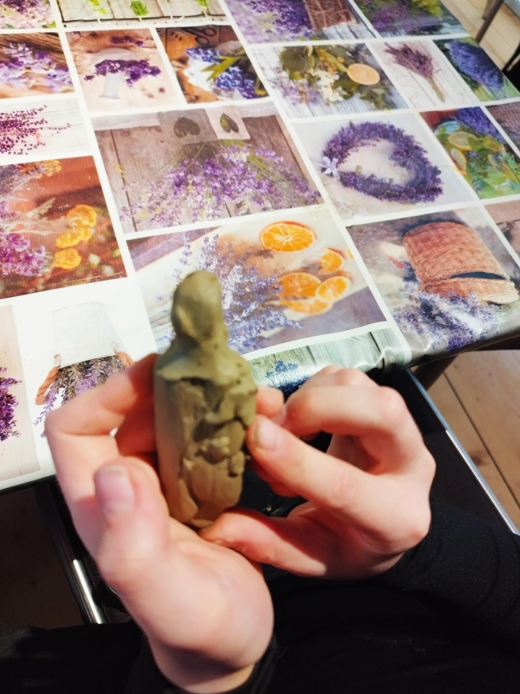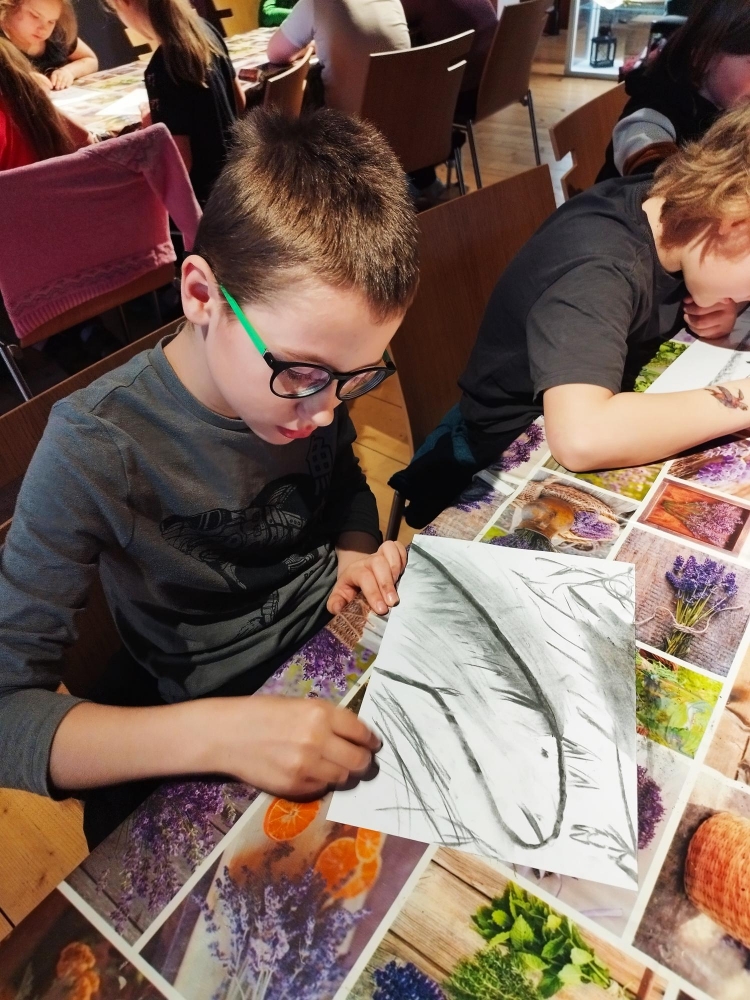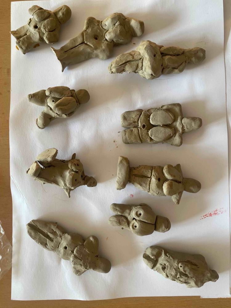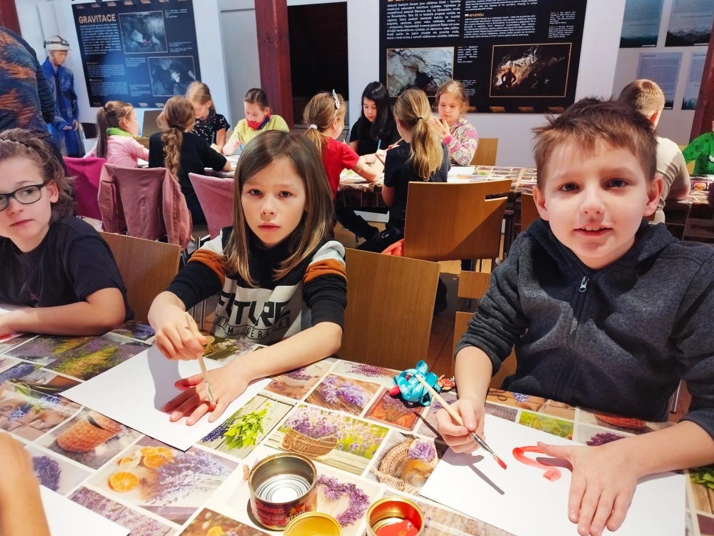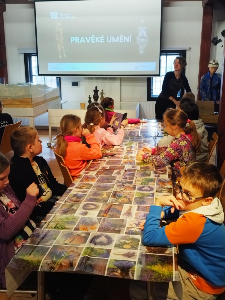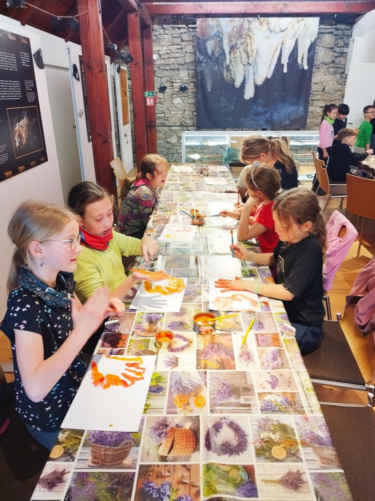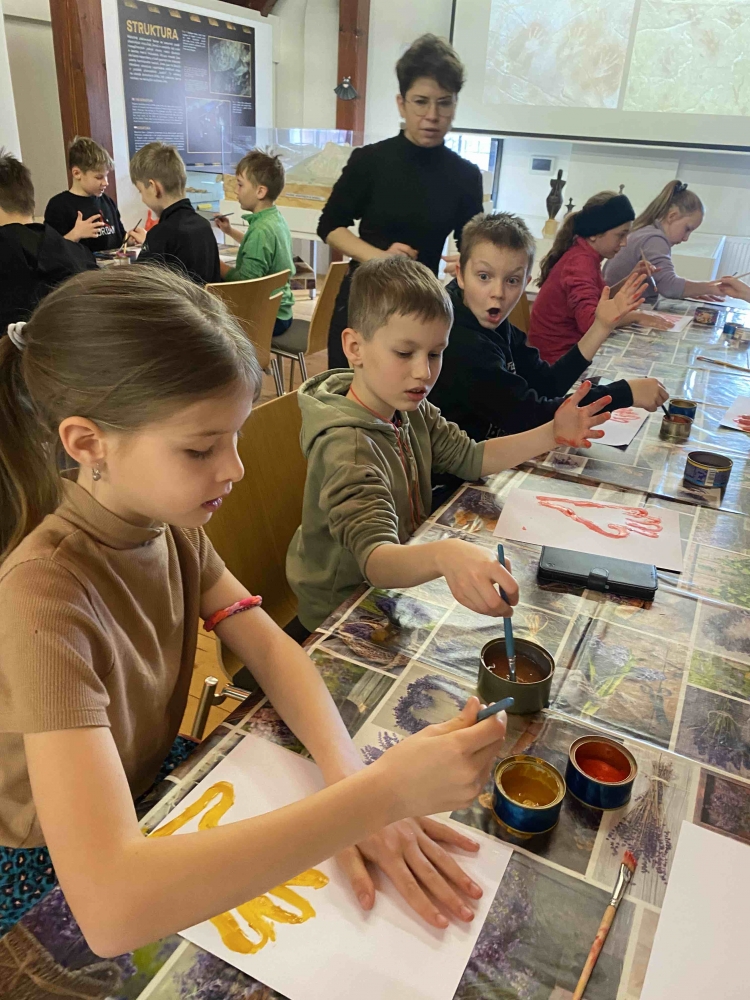 Ve druhé části programu, která probíhala v muzeu, si zahráli na pravěké umělce. Zhotovovali otisky, kreslili zvířata a modelovali dle své fantazie postavy, zvířata a nástroje z doby pravěku. Prohlédli si také exponáty vystavené v muzeu.