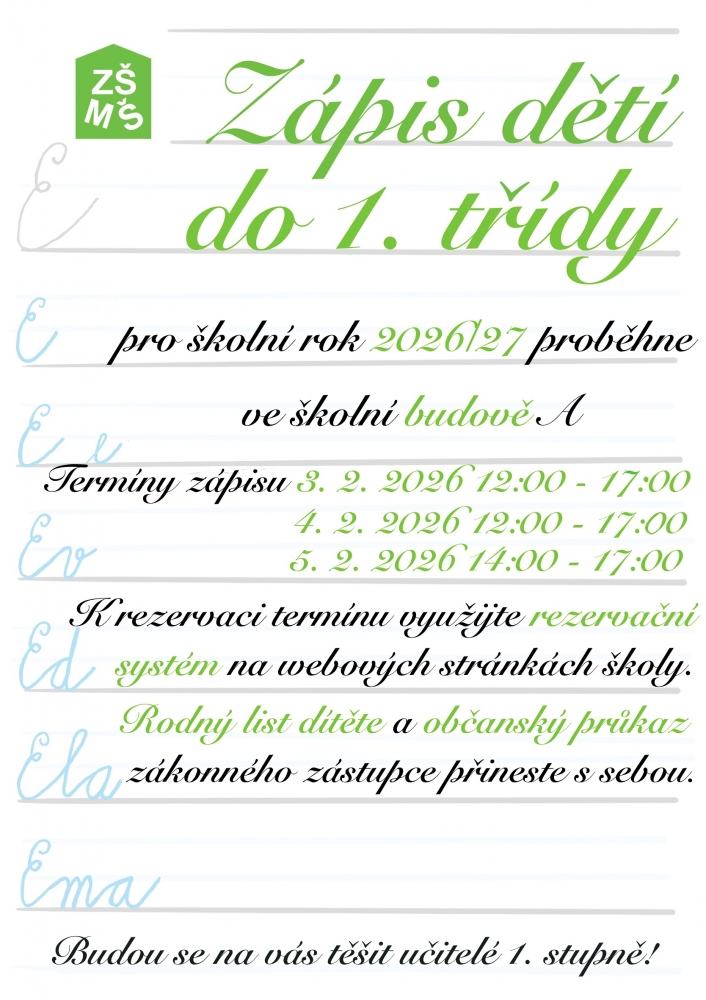 Ve dnech 3. - 5. 2. 2026 proběhne zápis do první třídy školního roku 2026/2027. Bližší informace