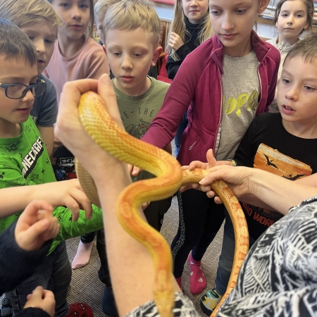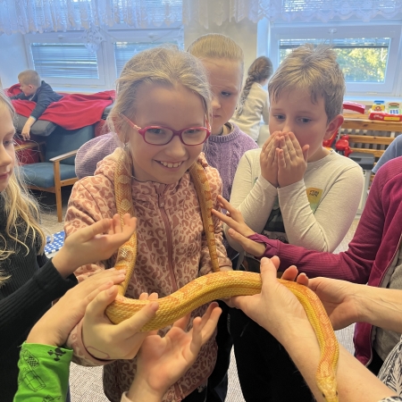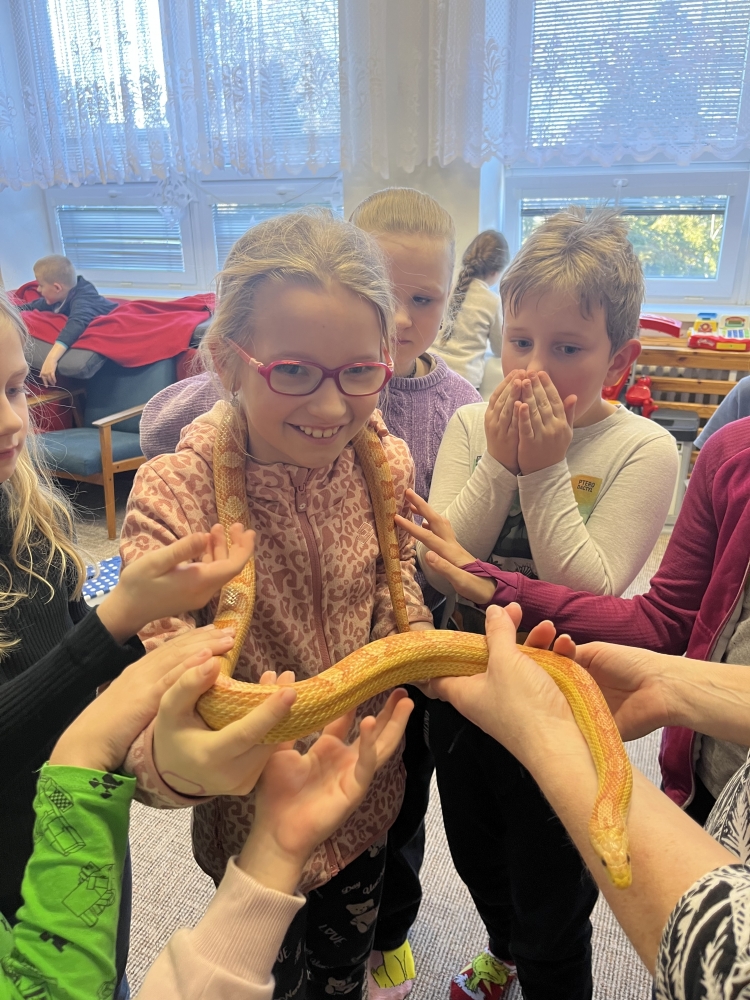 Dnes nás v družině navštívila užovka červená. Děti se dozvěděly spoustu informací a zajímavostí nejen o užovce, ale i o ostatních hadech. Většina dětí sebrala odvahu si hada pohladit, potěžkat a ti největší odvážlivci si užovku dokonce nechali nasadit i za krk. Návštěva se dětem tak líbila, že se s ní nechtěly ani rozloučit a chtěly si užovku nechat v družině napořád.17.03.2025 Zpět